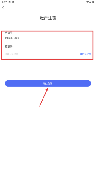 4、在账户注销页面,输入手机号和验证码,点击确认注销按钮,完成账户注销操作。
