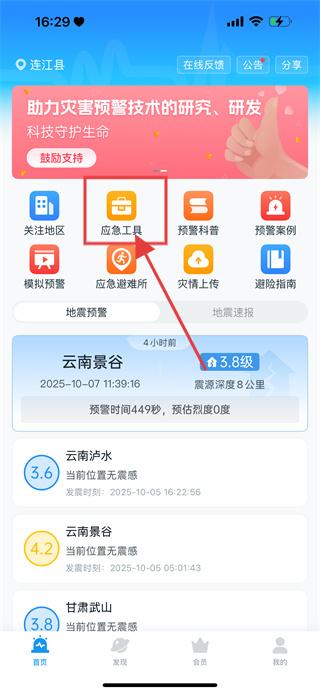 1、在地震预警的首页,点击应急工具,进入应急工具页面。