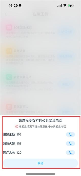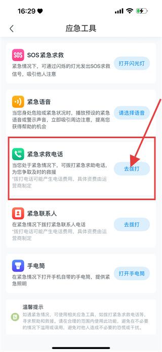2、在应急工具页面,点击紧急求救电话旁的去拨打,弹出公共紧急电话选择窗口。