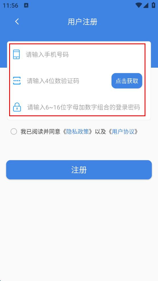 3、在用户注册页面,输入手机号码,点击获取验证码,输入验证码,再设置符合要求的登录密码。