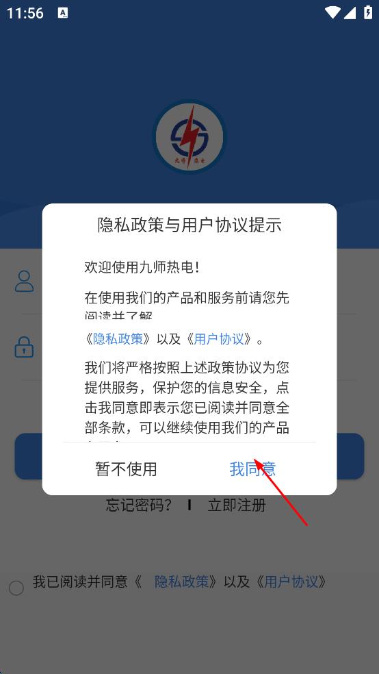 1、打开九师热电,在弹出的隐私政策与用户协议提示页面,点击我同意,进入登录页面。