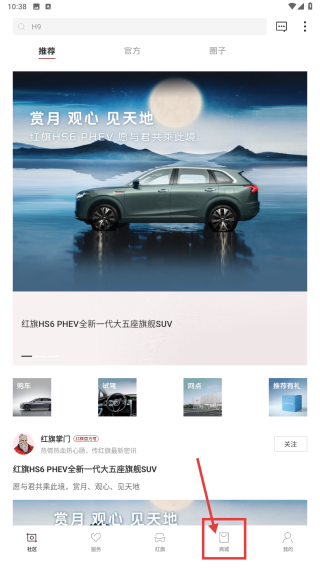 1、打开红旗汽车应用,点击底部商城选项,进入商城页面。