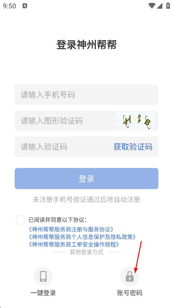 1、打开神州帮帮登录页面,点击下方账号密码选项,进入账号密码登录界面。