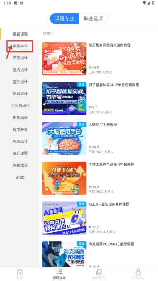 2、在课程分类页面,点击电脑办公分类,浏览该分类下的课程列表。