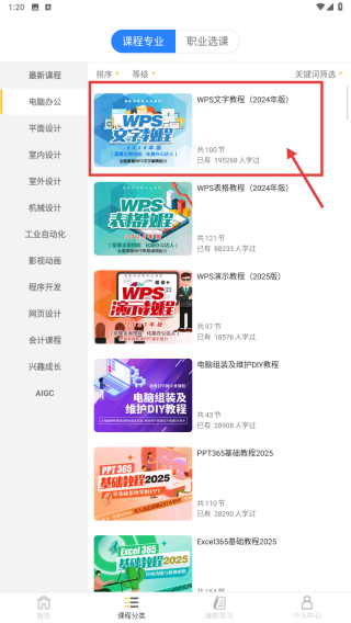 3、在电脑办公课程列表里,找到WPS文字教程2024年版课程条目,点击进入学习。