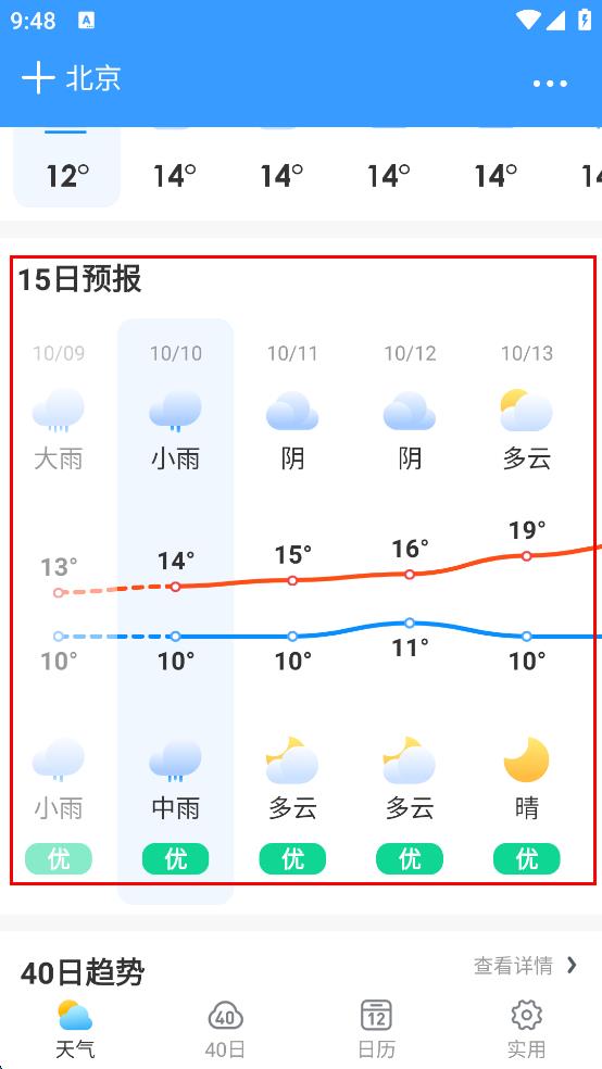 4、向上滑动页面,还能查看该城市未来15日的天气预报,了解后续天气变化趋势。