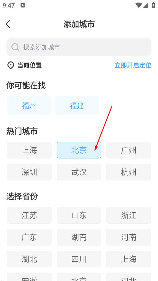 2、在APP主界面,进入添加城市页面,选择要查看天气的城市,比如点击“北京”。