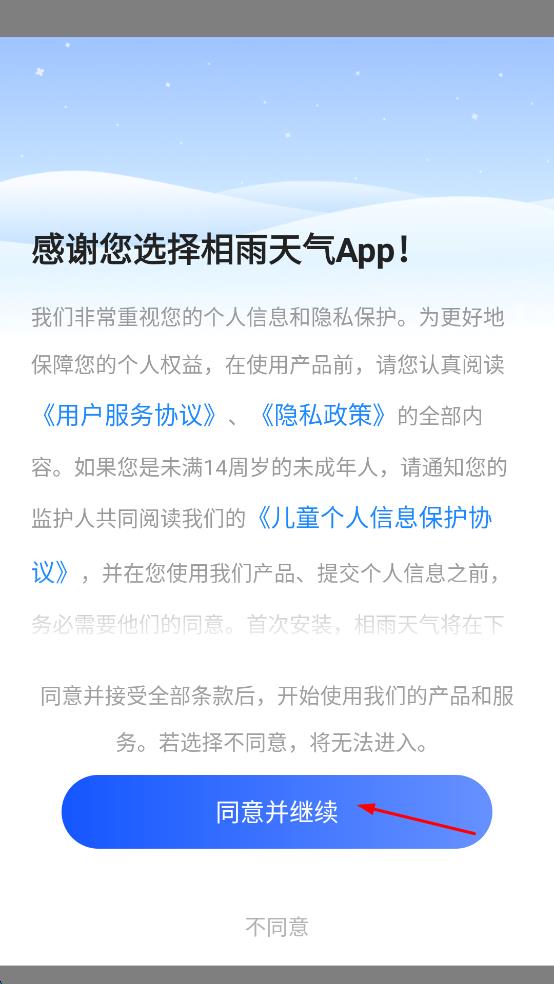 1、打开相雨天气APP,在弹出的协议页面,点击“同意并继续”按钮,进入APP主界面。