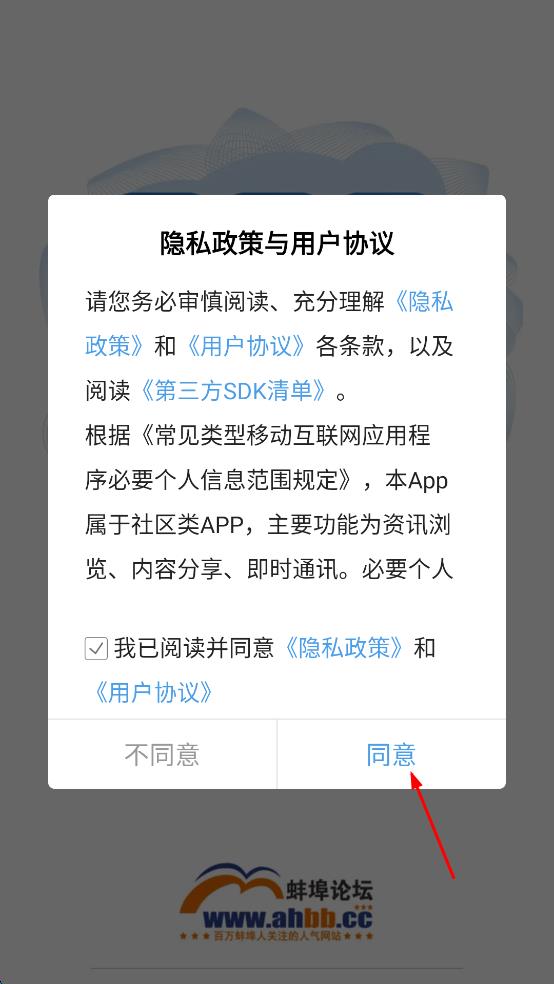 1、打开蚌埠论坛APP,会弹出隐私政策与用户协议提示框,点击“同意”按钮。