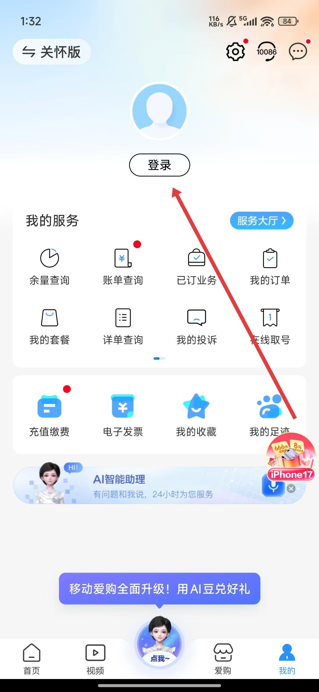 1、在进入到中国移动App后,可以在我的页面中,点击登录按钮后进行操作。