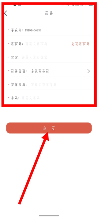 5、填写手机号、验证码、密码、证件类型及号码等信息,点击提交,完成注册。