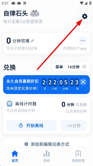2、在自律石头主界面,点击右上角的设置图标,进入设置页面。