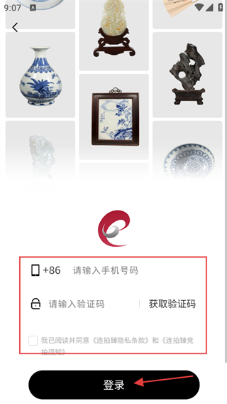 2、填写、手机号码、验证码,勾选同意连拍臻隐私条款和连拍臻竞拍须知,点击登录。