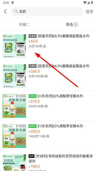 3、在搜索结果列表中,找到你需要购买的农药产品,点击进入产品详情页面。