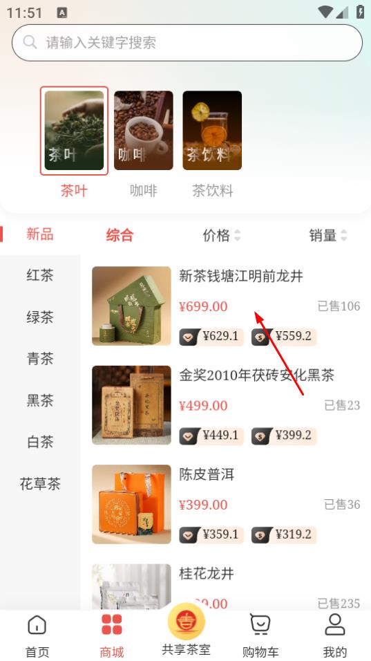 2、在商城页面,选择想要购买的茶叶,比如新茶钱塘江明前龙井。
