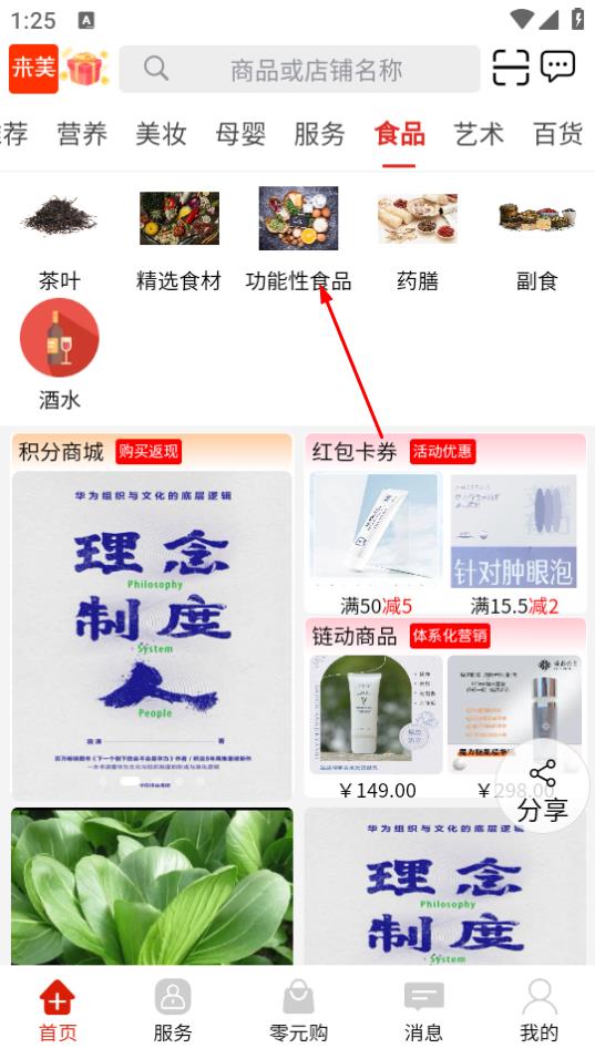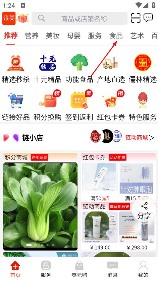 1、打开来美商城,在首页点击食品分类标签。
