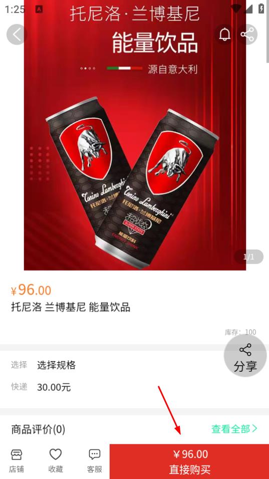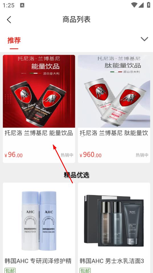 3、在商品列表中,点击想要查看的商品,如托尼洛兰博基尼能量饮品。