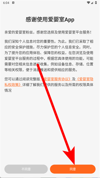 1、打开爱婴室APP,在页面点击同意,进入首页。