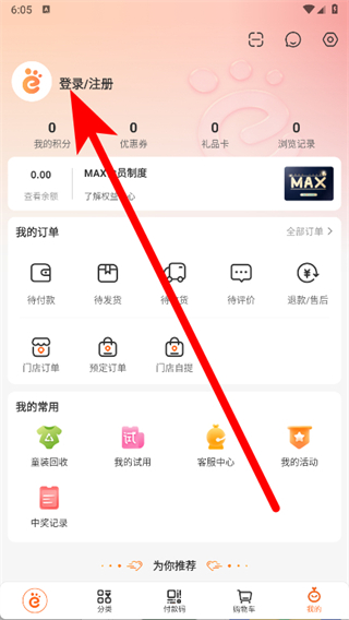 3、在个人中心页面,点击登录注册按钮,进入登录注册界面。