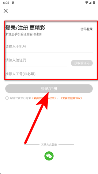 4、输入手机号,获取并输入验证码,勾选同意相关协议后,点击登录注册,完成账号注册或登录。