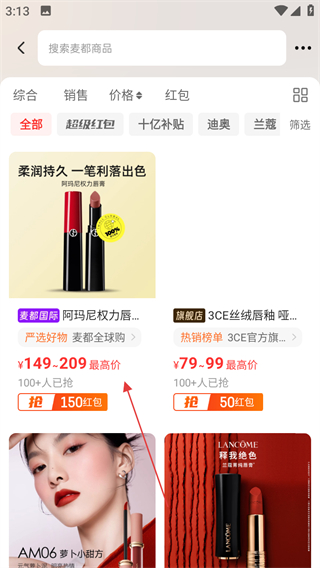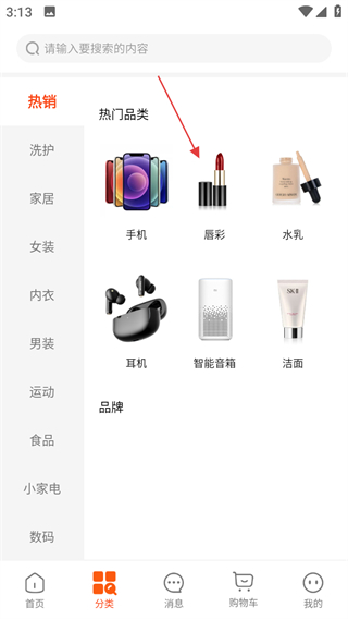 2、在分类页面,点击唇彩,进入唇彩商品列表页面。