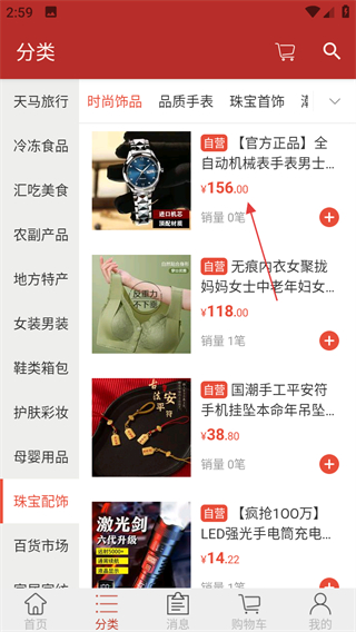 2、在分类页面,点击珠宝配饰,进入珠宝配饰商品列表页面。