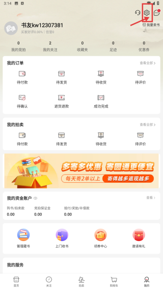 2、在个人中心,点击右上角设置图标,进入设置功能区。
