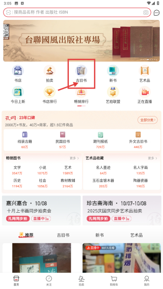 1、打开图书电商应用,点击古旧书分类,进入古旧书页面。