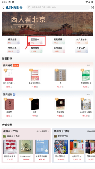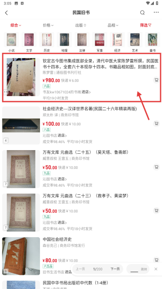 2、在古旧书页面,选择民国图书分类,进入民国图书列表页面。