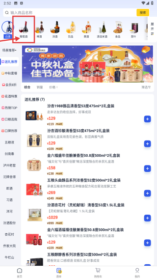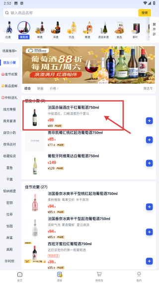 2、在分类页面,选择红酒分类,进入红酒商品列表页面。
