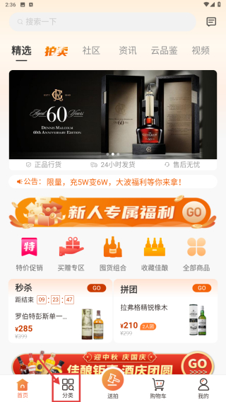 1、打开酒类电商应用,点击底部分类选项,进入商品分类页面。