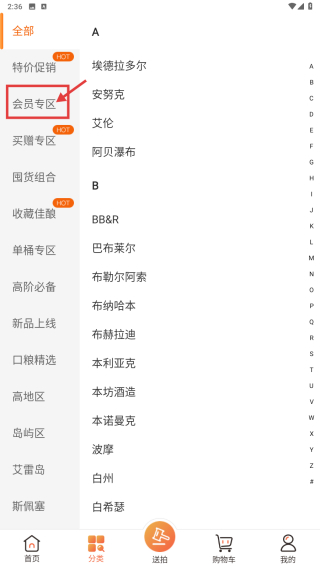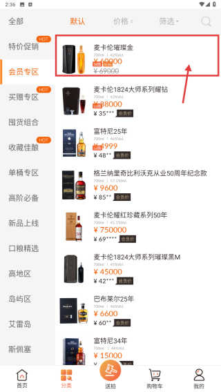 2、在分类页面,选择会员专区分类,进入会员专属商品列表页面。