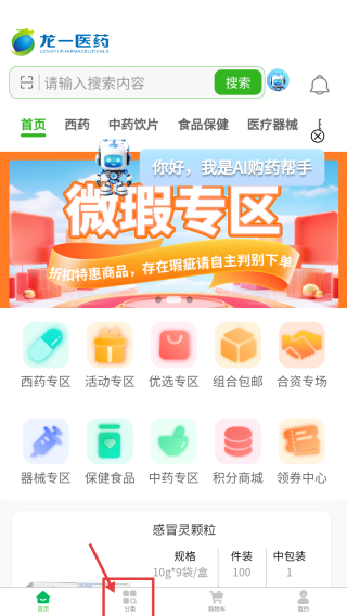 1、打开龙一医药应用,点击底部分类选项,进入药品分类页面。