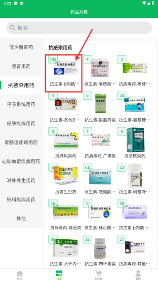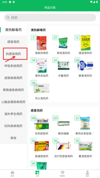 2、在药品分类页面,选择抗感染用药分类,进入抗感染用药列表页面。