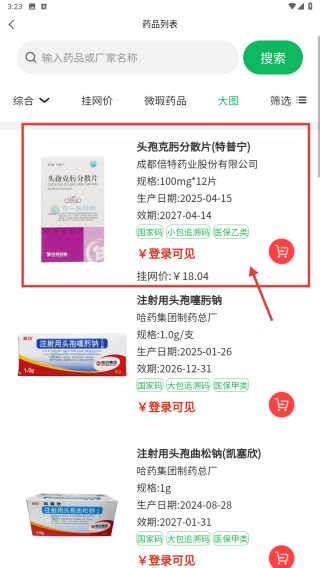 3、选择头孢克肟分散片特普宁药品条目,进入药品详情页面。