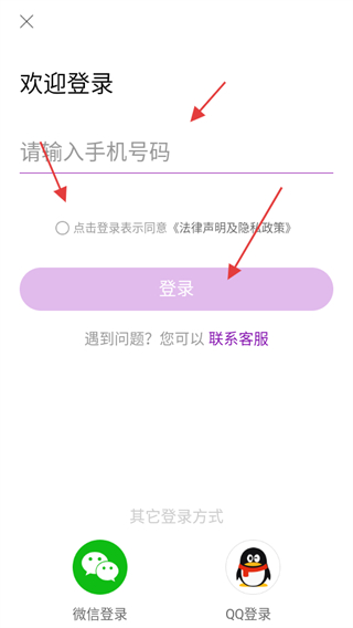 3、进入登录页面,输入手机号码,勾选法律声明及隐私政策,点击登录。