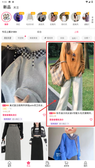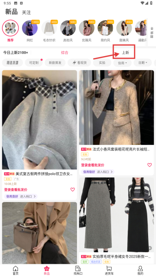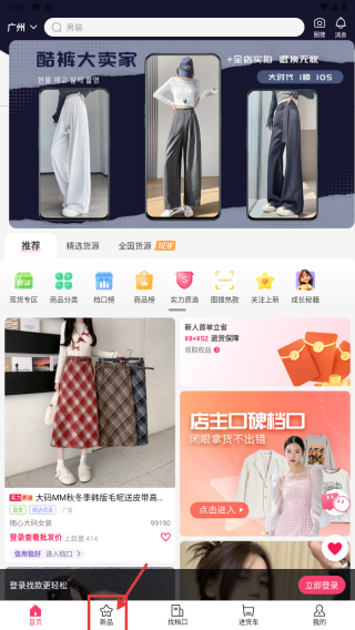 1、打开服装电商应用,点击底部新品选项,进入新品页面。
