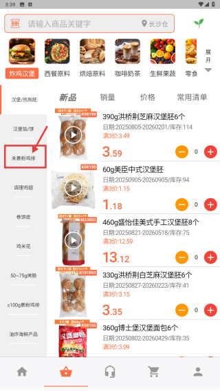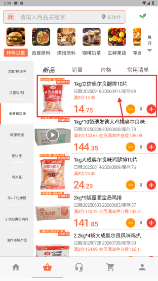 2、在商品浏览页面,点击左侧未裹粉鸡排分类,筛选对应商品列表。
