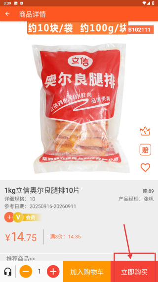 3、在商品列表中,找到1kg立信奥尔良腿排10片条目,点击进入商品详情页。