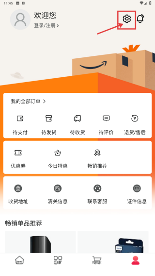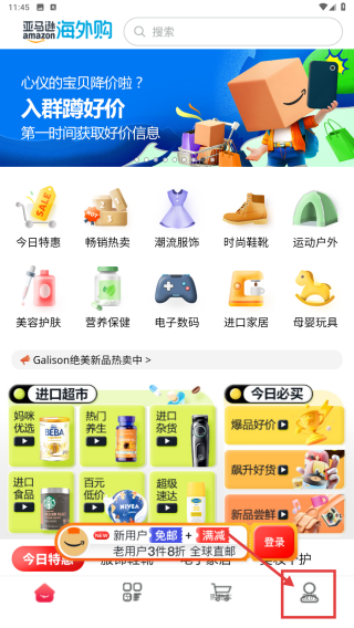 1、打开亚马逊海外购应用,点击底部我的选项,进入个人中心页面。