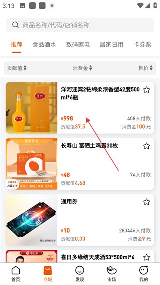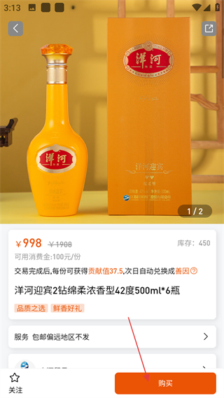 2、在商城页面,点击洋河迎宾2钻绵柔浓香型商品,进入商品详情页面。