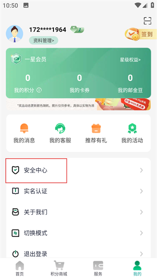 2、在个人页面,点击安全中心,进入安全中心页面。