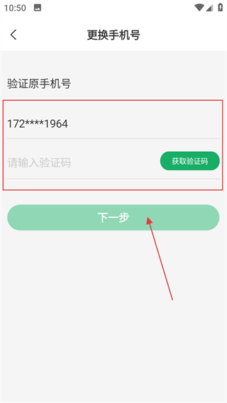 4、在更换手机号页面,输入信息后,点击下一步,完成手机号更换操作。
