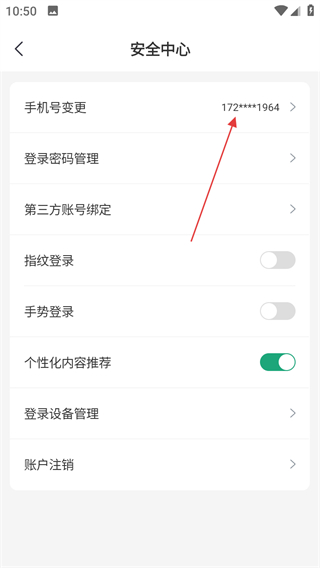 3、在安全中心页面,点击手机号变更,进入更换手机号页面。