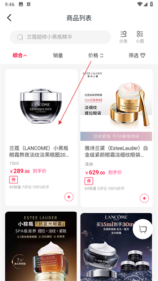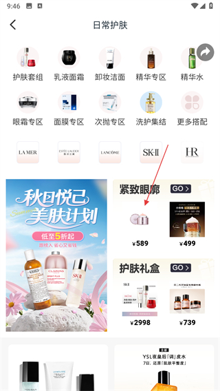 2、在日常护肤商品展示页,挑选心仪的商品,点击商品进入商品列表页。