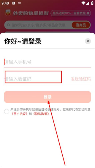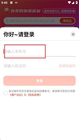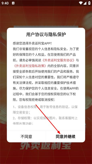 1、打开外卖返利宝,在弹出的界面,点击同意并继续。