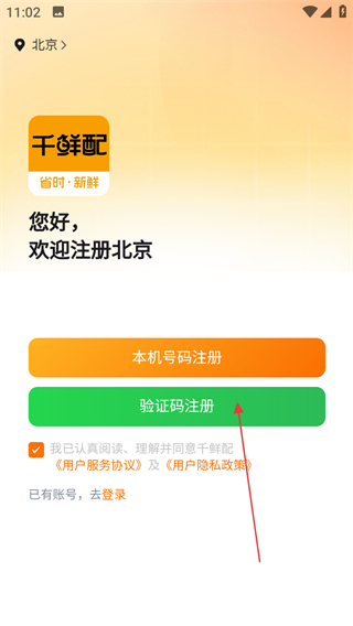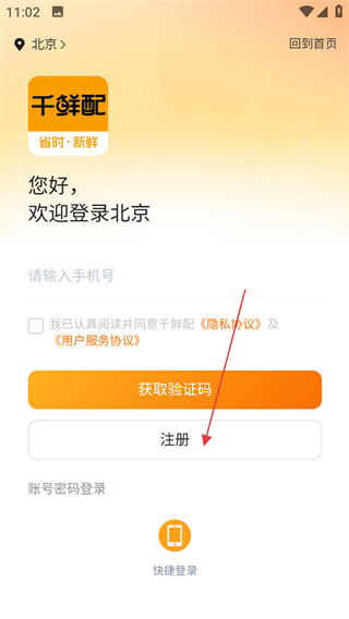 4、在注册选择页面,点击验证码注册,进入验证码注册页面。