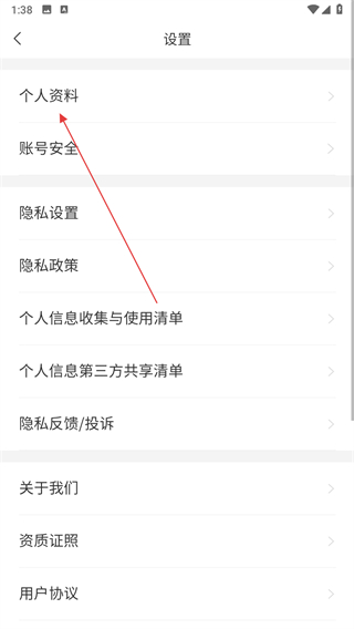 2、在设置界面,点击个人资料,进入编辑资料页面。