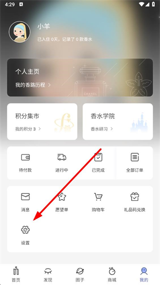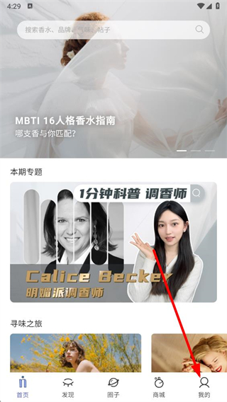 1、打开香水时代app,点击底部导航栏中的我的选项。