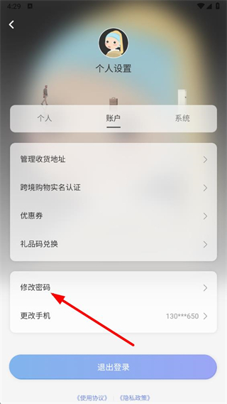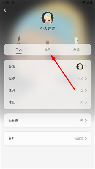 3、在个人设置页面,点击账户选项,切换到账户设置界面。